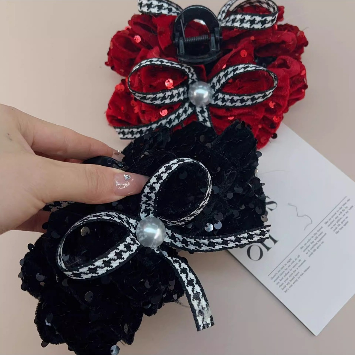 Bow Shark Clip 2024 new black Burgundy full Star broken diamond tassel sweet grab clip female advanced sense