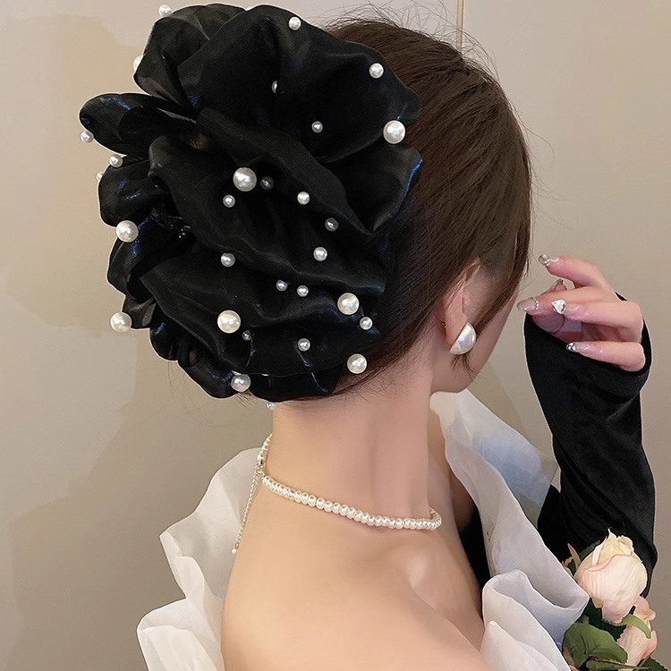 2023 New bubble mesh pearl grab feminine multi-layer bow oversized back head shark clip